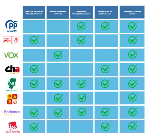 Cinco son las formaciones que se comprometen a alcanzar progresivamente el 25 por ciento de inversión en Atención Primaria sobre el total del presupuesto sanitario: PSOE, Chunta Aragonesista (CHA), la coalición Existe-Aragón Existe, Podemos e Izquierda Unida-Sumar (IU-Sumar). El partido liderado por