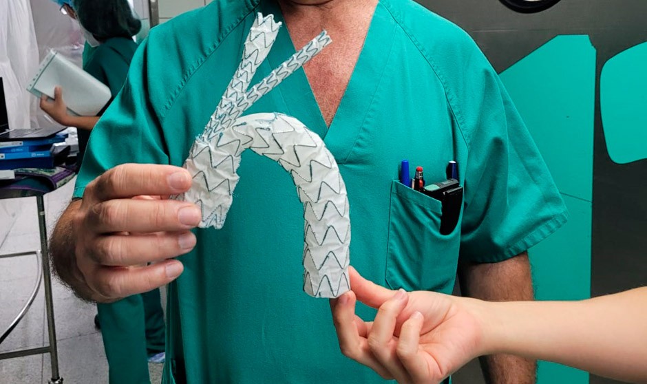 El diseño de esta innovadora endoprótesis, "permite mantener la perfusión sanguínea a las carótidas y las extremidades superiores durante la cirugía mediante dos ramas que se conectan a la endoprótesis torácica a nivel del cuello" señala el jefe del servicio de Angiología y Cirugía Vascular, José Luis Perez Burkhardt, que realizó la intervención con el apoyo de Jaume Dilmé, del Hospital de la Santa Creu i Sant Pau de Barcelona, y la colaboración del equipo de Anestesiología, Neurofisiología y Enfermería. “El principal beneficio que aporta esta tecnología es poder ofrecer un tratamiento menos agresivo a aquellos pacientes que presentan alto riesgo o en los que está contraindicada la cirugía abierta", añade.