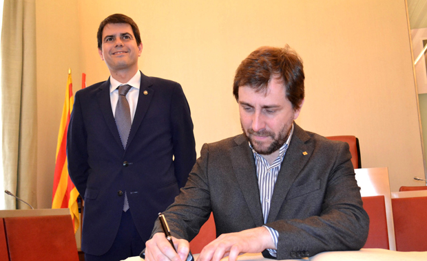 El consejero de Salud, Antoni Comín, firma el libro de Honor del Ayuntamiento de Igualada.