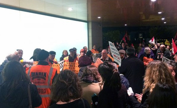 Círculo de Salud había convocado un acto en el hospital Sant Joan de Deu, en Esplugues de Llobregat, y a las puertas del mismo se han manifestado un centenar de personas convocadas por Marea Blanca, entre los que había miembros destacados de la CUP, que, pese a la lluvia, se han concentrado con carteles en defensa de la sanidad pública.