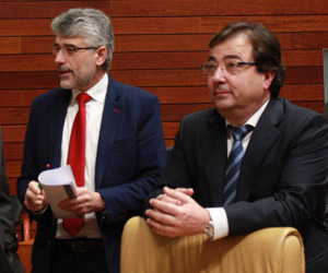 El portavoz del PSOE, Valentín García (izquierda), junto con el presidente de la Junta de Extremadura, Guillermo Fernández Vara, durante el pleno.