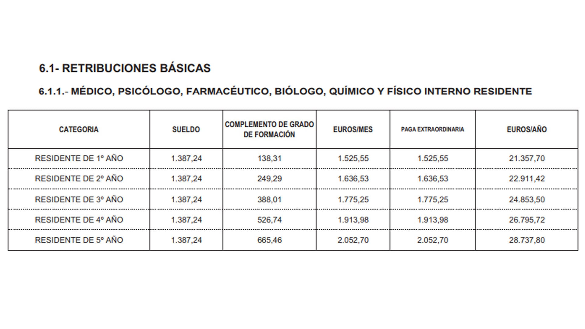 1.387,24 euros mensuales. Los complementos por el grado de formación varían desde los 138,31 euros en primer año hasta los 665,46 euros en quinto año, llegando hasta las