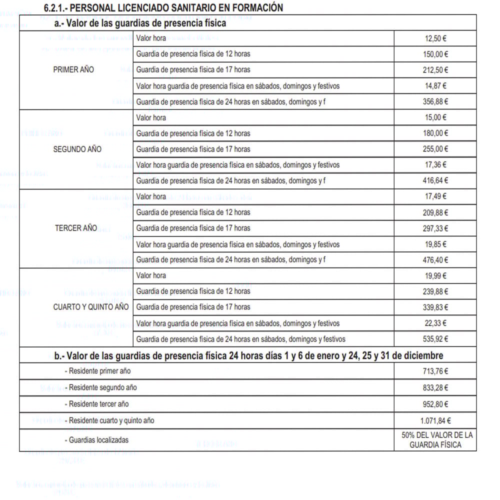 año de la residencia, iniciando con un valor de hora de 12,50 euros en primer año hasta llegar a los 19,99 euros en cuarto y quinto año. Se detallan, además, los montos por guardia de presencia física de 12 horas, de 17 horas, el valor la guardia de presencia física en sábados, domingos y festivos y la guardia de presencia física de 24 horas en sábados, domingos y festivos, según el año de formación.