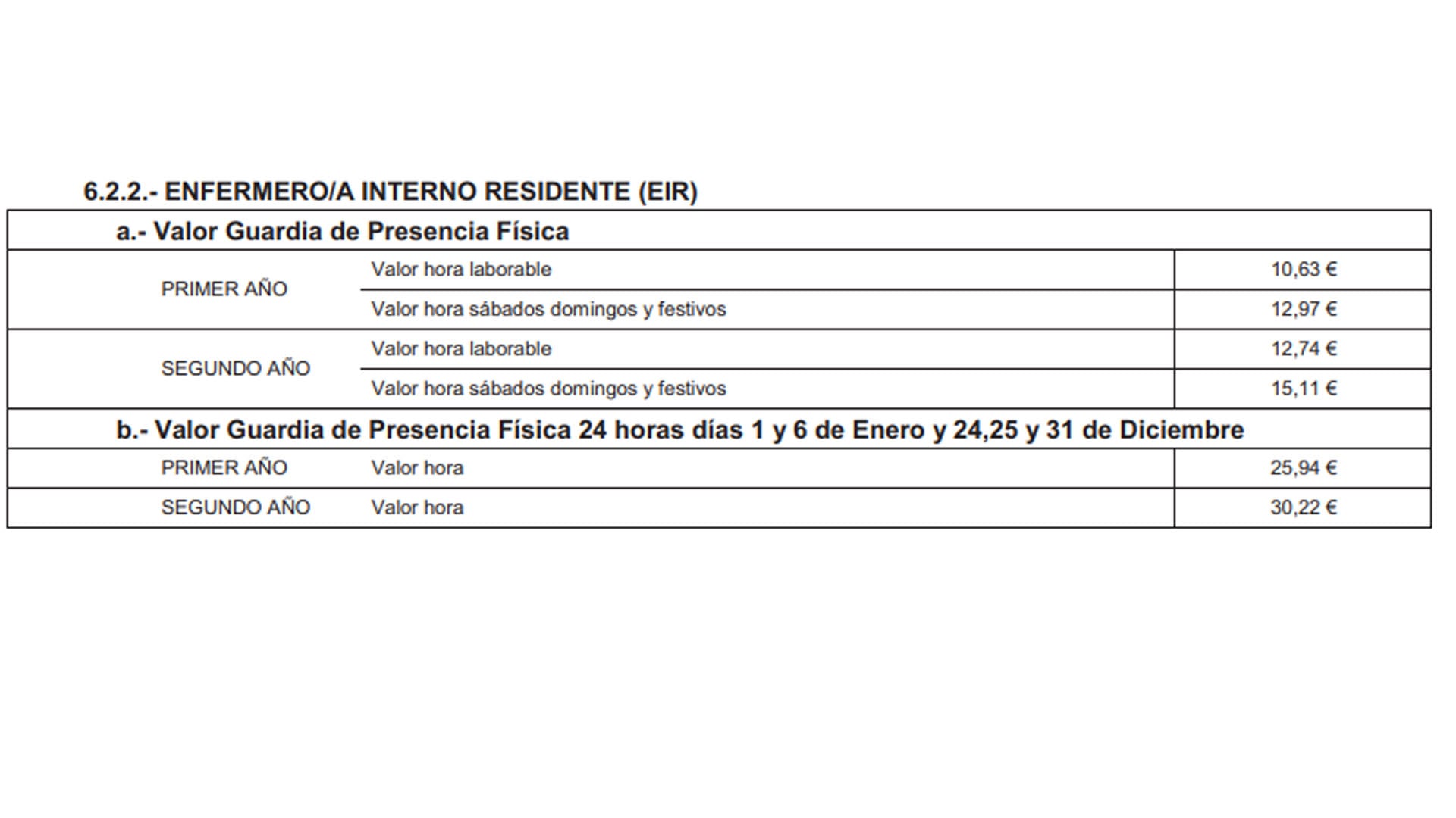 Para las guardias de presencia física 24 horas los días 1 y 6 de enero, y 24, 25 y 31 de diciembre, el valor hora en primer año es de