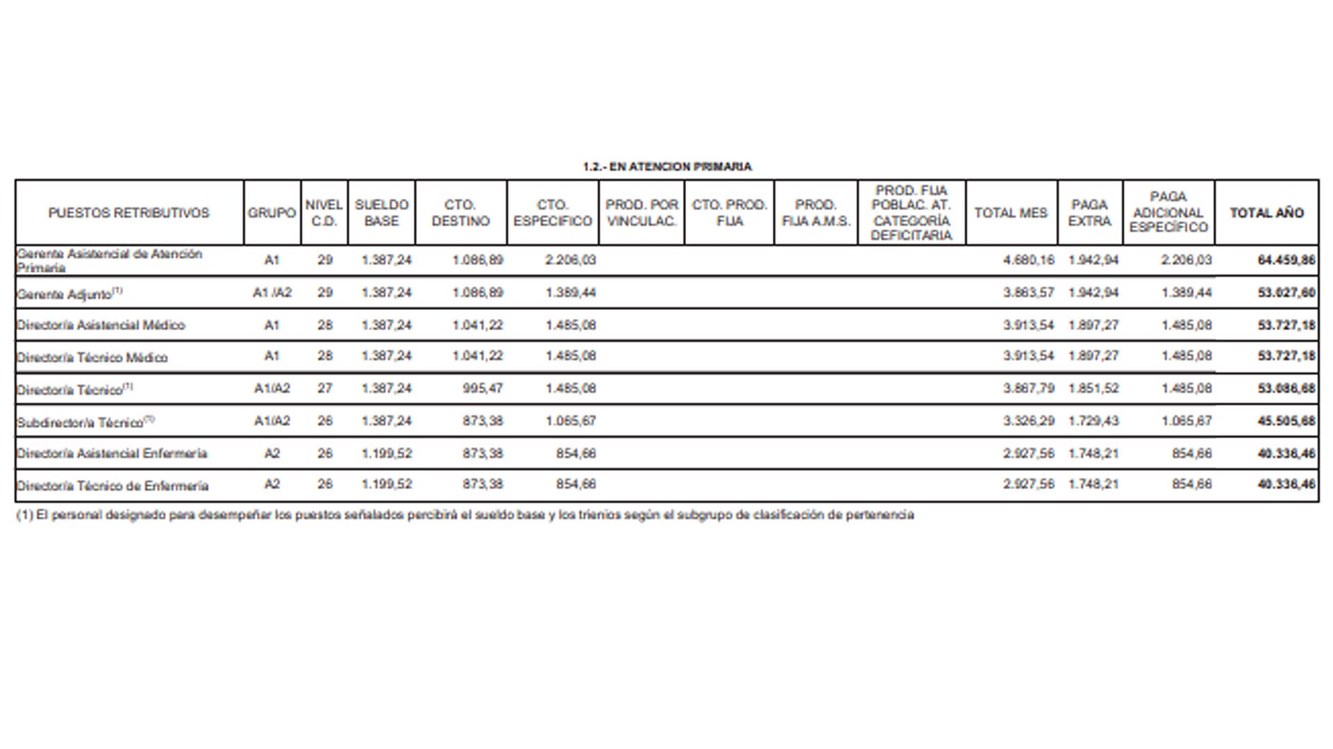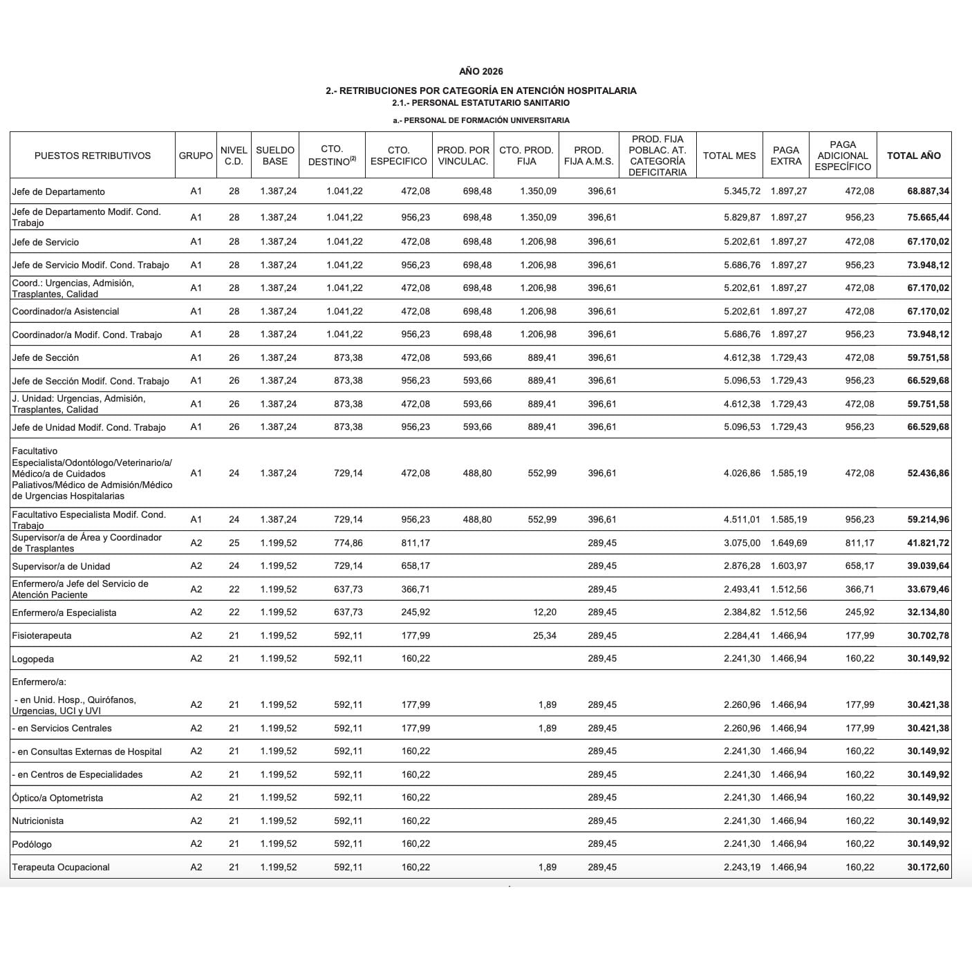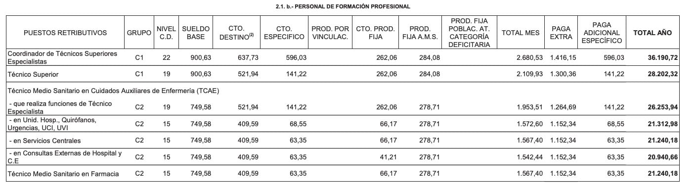 conceptos que contemplan para todas las categorías sanitarias son: sueldo, complemento de destino, complemento específico, productividad por vinculación, productividad fija, productividad de Acuerdo de Mesa Sectorial, paga extraordinaria y paga adicional del complemento específico.