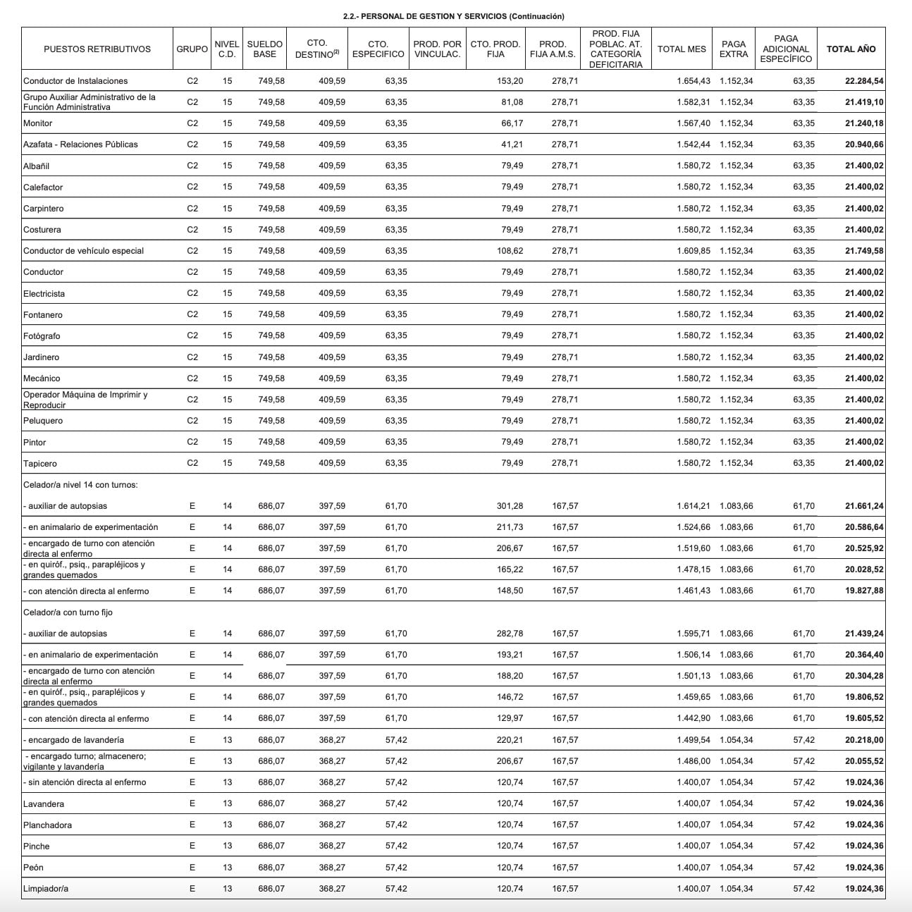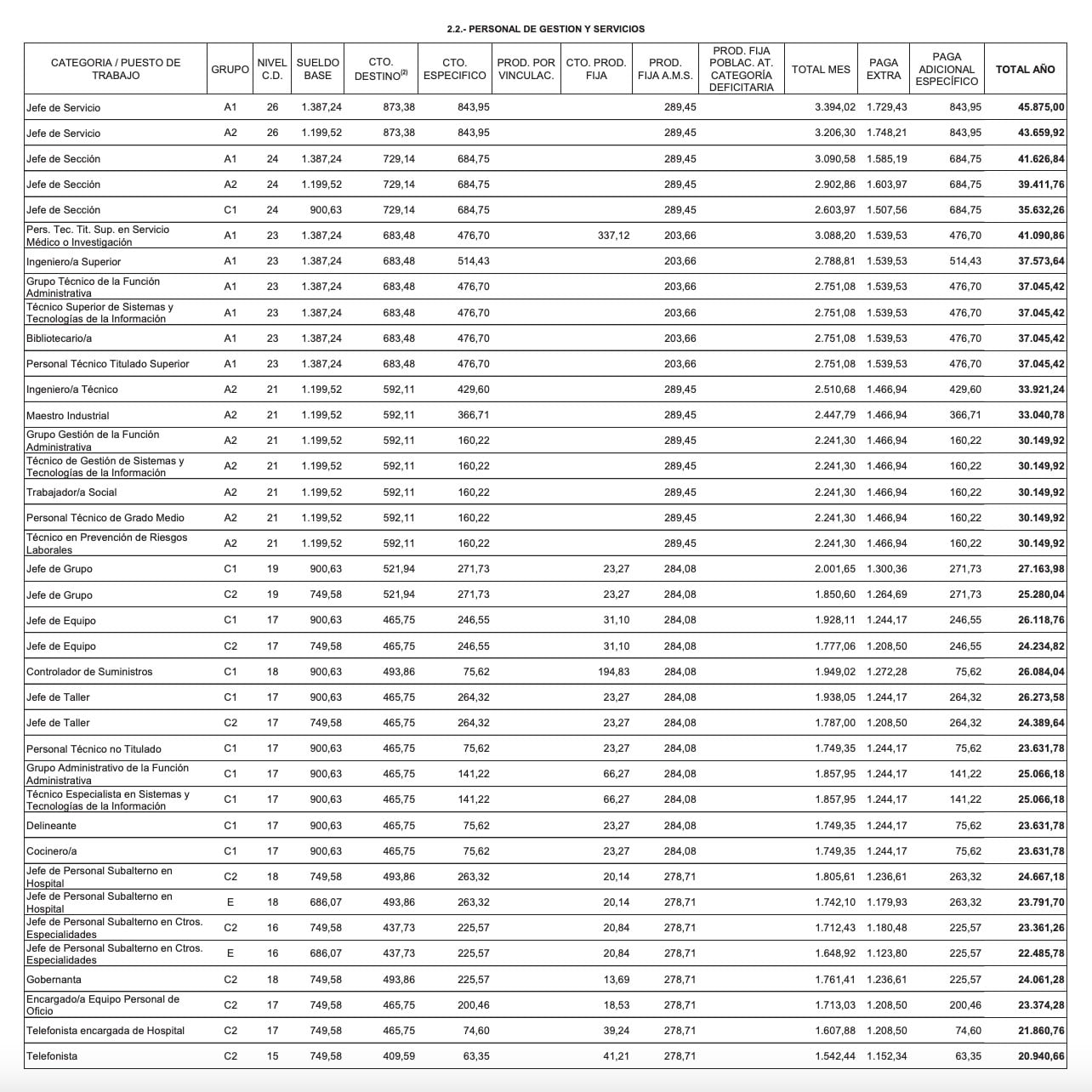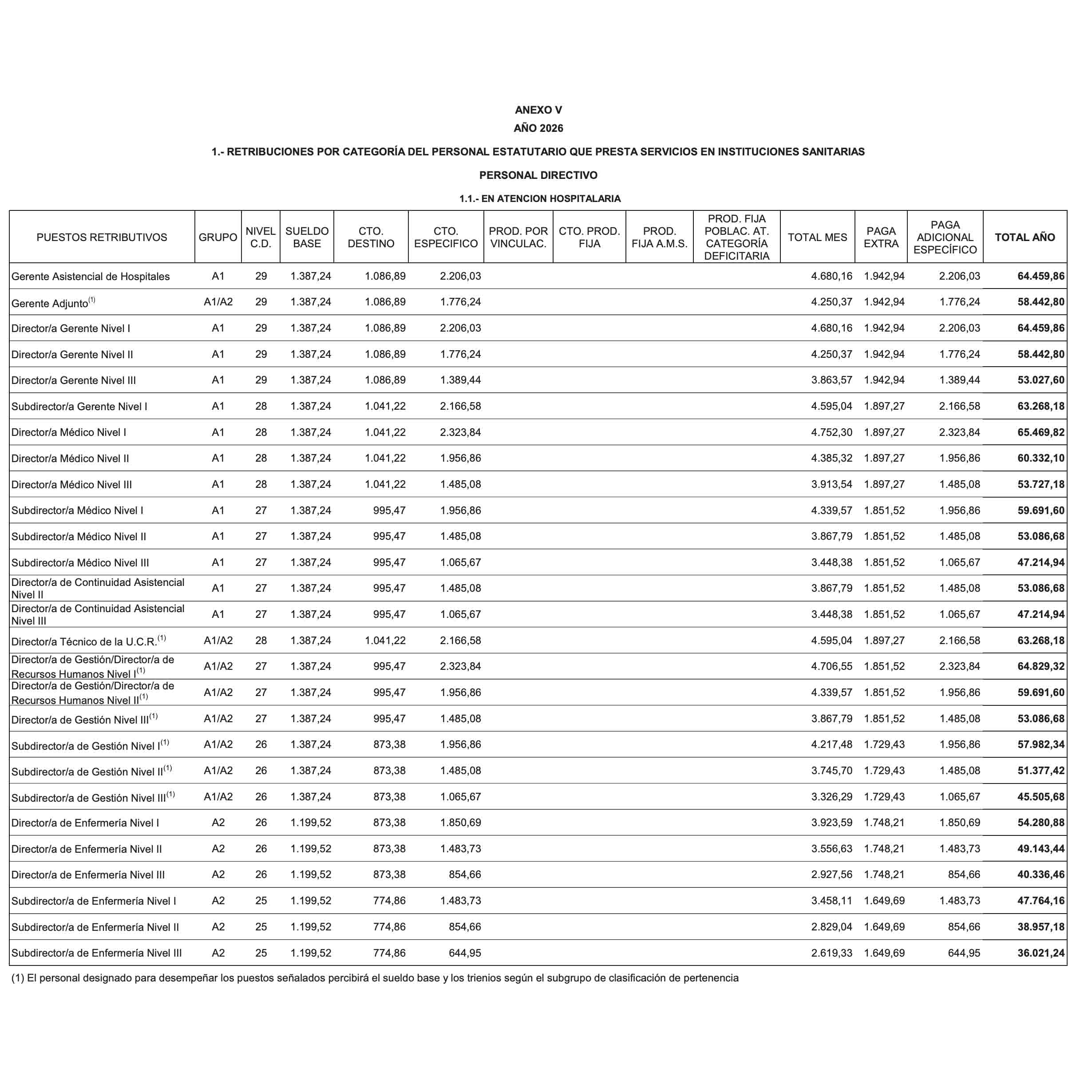 conceptos que contemplan para todas las categorías sanitarias son: sueldo, complemento de destino, complemento específico, productividad por vinculación, productividad fija, productividad de Acuerdo de Mesa Sectorial, paga extraordinaria y paga adicional del complemento específico.