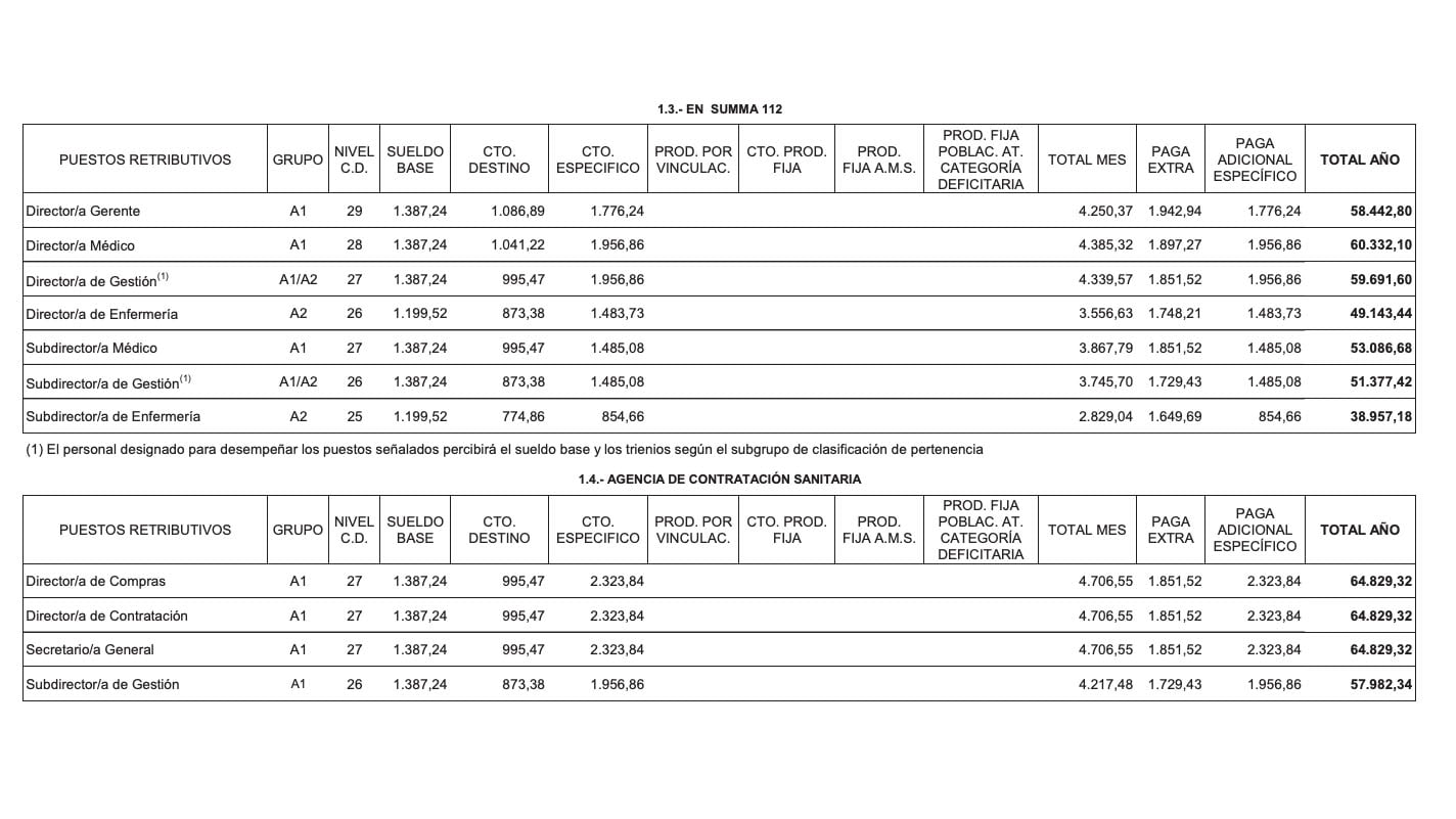 Atención Primaria, Hospitalaria, Summa 112 o en la Agencia de Contratación Sanitaria-, contemplan el concepto de sueldo, el complemento de destino, el complemento específico, la productividad por vinculación, la productividad fija, la productividad de Acuerdo de Mesa Sectorial, la paga extraordinaria y la paga adicional del complemento específico. Las dos últimas "en los