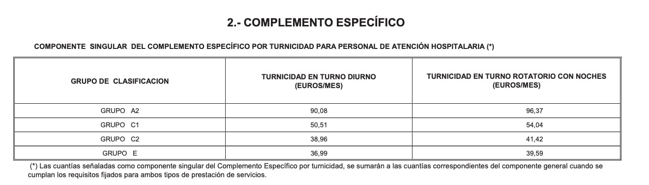 complemento específico por turnicidad para personal de Atención Hospitalaria para los grupos A2, C1, C2 y E, con los montos por