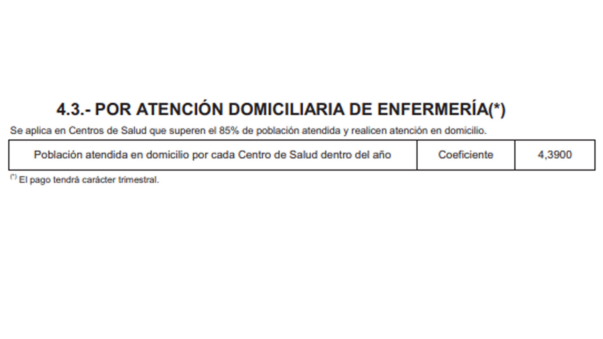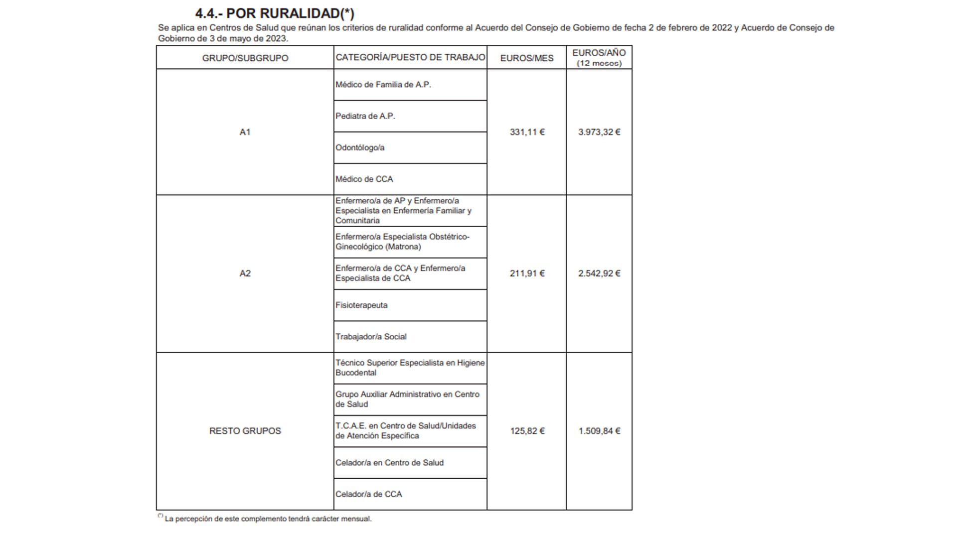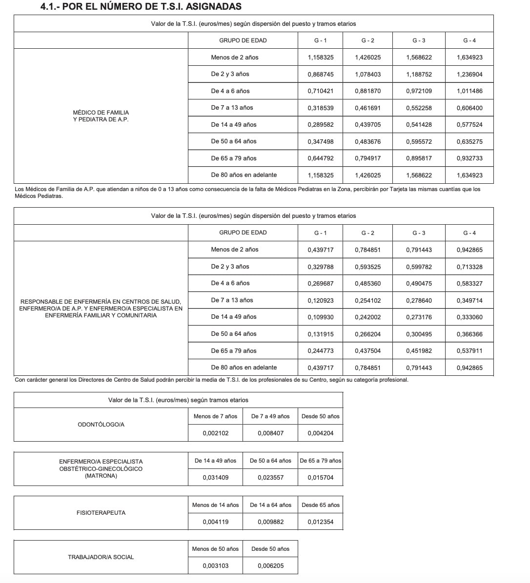 TCAE, grupo auxiliar administrativo de la Función Administrativa y celador, como no cuentan con población asignada mediante Tarjeta Sanitaria Individual, "se les asignará la población de los médicos de Familia del centro de salud". La comunidad indica que "se abonará por trimestres vencidos".