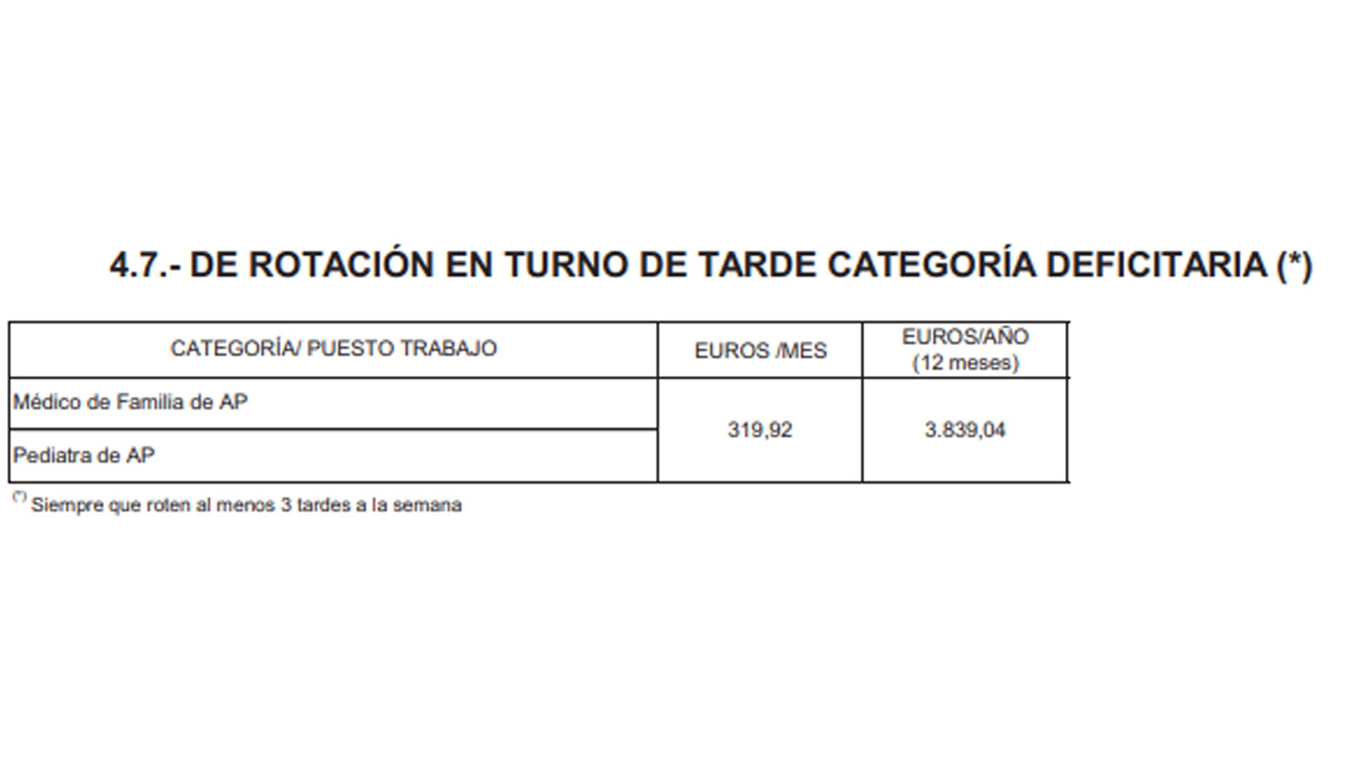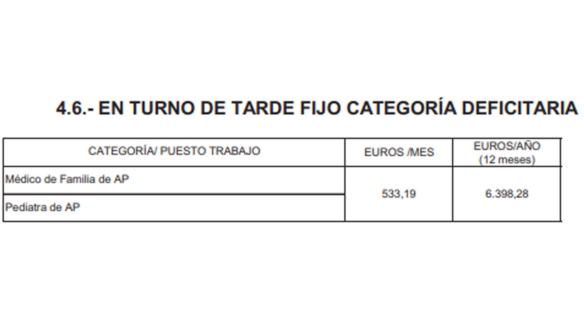 Estas cuantías corresponden al complemento de productividad fija por rotación en turno en tarde también en las categorías deficitarias de médico de Familia y pediatra de Atención Primaria que percibirán un