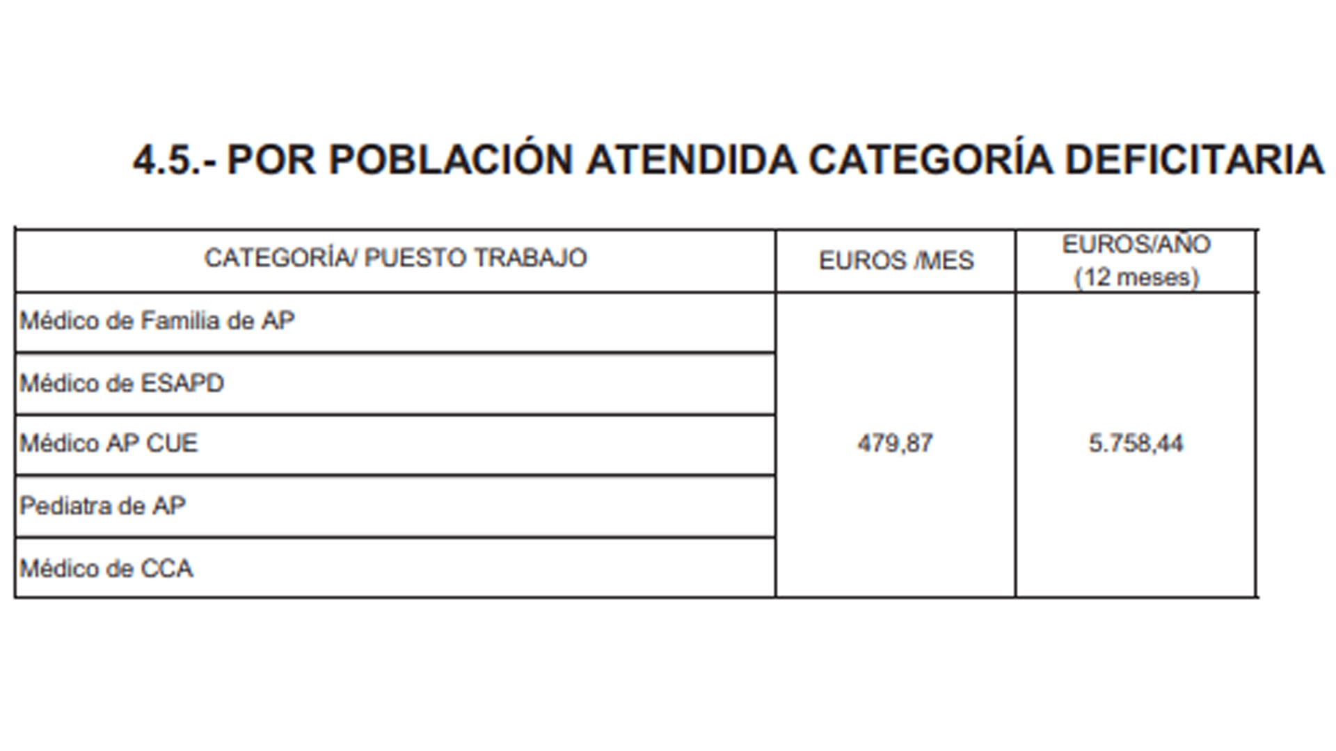 Estas cuantías corresponden al complemento de productividad fija por población atendida por categoría deficitaria. Se abonará a los médicos de Familia y pediatras de Atención Primaria, así como a los médicos de los nuevos dispositivos de continuidad asistencial, "siempre que desarrollen actividad asistencial con carácter permanente". Eso sí, este complemento
