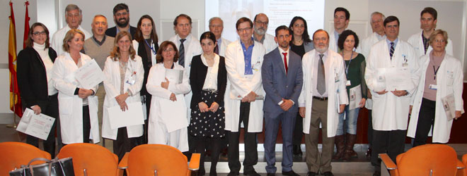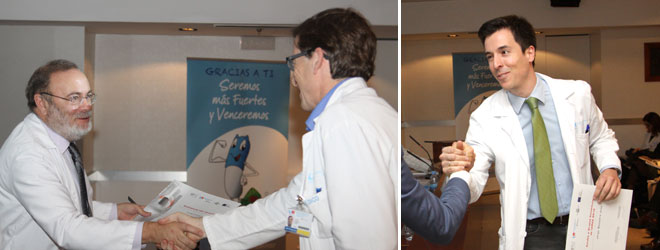 Rafael Pérez-Santamarina entrega el premio a la publicación más relevante a José Ramón Ariibas, jefe de la Unidad de Enfermedades Infecciosas. A la derecha, Jorge Bonastre, especialista en Cirugía Plástica, Estética y Reparadora en el Hospital Universitario La Paz, recibe el suyo por uno de los grupos de investigación constituido en 2014.