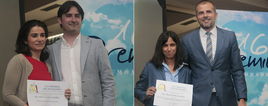 Felipe Villar, director de Revista de Patología Respiratoria, entrega el premio a la mejor publicación en esta revista a Silvia Sánchez. David Lipiani, jefe regional de ventas de Analgesia y Respiratorio de Mundipharma, entrega el premio a la mejor publicación nacional a Elena Ojeda. |