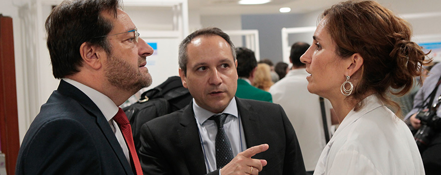 Enrique Ruiz Escudero y Ángel Garrido son recibidos por Carmen Martínez de Pancorbo a las puertas del Centro de Actividades Ambulatorias del Hospital 12 de Octubre. |
