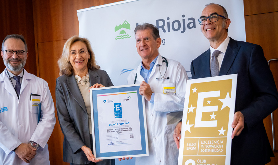 El Servicio de Neumología del Hospital Universitario San Pedro ha logrado el Sello de Excelencia Europea EFQM 400+, una de las acreditaciones más exigentes a nivel europeo, otorgado por el Club de Excelencia en Gestión, asociación sin ánimo de lucro que representa en España a la EFQM (European Foundation for Quality Management), con un rango de puntuación de 450 - 499 puntos EFQM.
