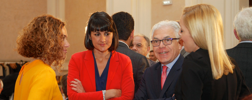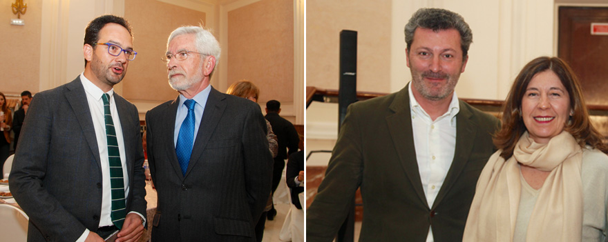 Antonio Hernando, portavoz del PSOE en el Congreso de los Diputados, conversa con Joan Lerma, ex presidente de la Generalitat Valenciana y actual vicepresidente segundo del Senado. En la segunda imagen, Santiago Cervera, CEO en Healthy Numbers Consulting, acompañado de Yolanda Erburu, directora de comunicación de Sanitas.