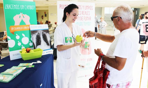 Bajo el lema 'Un cigarrillo por una manzana', se ha instalado un stand saludable en ambos hospitales en el que profesionales sanitarios recuerdan la importancia de dejar de fumar para llevar una vida sana. Ofrecen fruta a todas aquellas personas que deseen pagar con una moneda especialmente cara: un cigarro. Más de un centenar de radiografías de pulmones sanos cuelgan del techo en este espacio “sin humo” para dar visibilidad a la mejora en la salud de aquellas personas que han logrado abandonar el tabaco. Los centros de salud de ambos Departamentos también cuentan con mesas informativas para informar sobre los riesgos de este hábito.