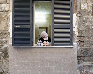 Una mujer con mascarilla en una ventana en Nápoles.