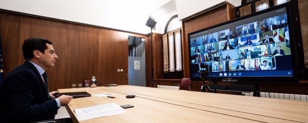 El presidente de la Junta de Andalucía, Juanma Moreno, durante la quinta reunión telemática de la Conferencia de Presidentes autonómicos con el presidente del Gobierno, Pedro Sánchez.
