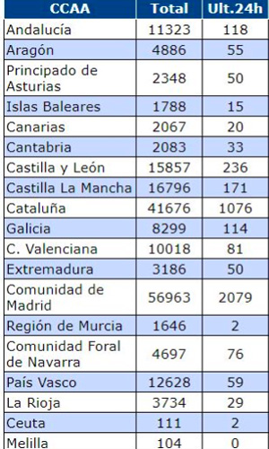 De acuerdo con el último informe, el número de nuevas muertes diarias con coronavirus en España se ha reducido a 410, lo que supone la menor cifra de aumento desde el pasado 22 de marzo. En la actualidad, hay 195.944 infectados, 4.218 más el último día. Incluidas las personas que han dado positivo en el test de anticuerpos pero son asintomáticas, el total asciende a 198.470 casos. El número total de fallecidos es de 20.453, y el de curados es de 77.357, con un incremento de 2.695 altas.
