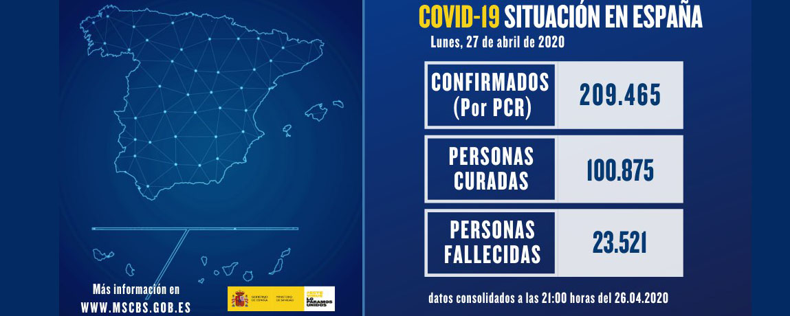 La pandemia del coronavirus Covid-19 sigue mostrando síntomas de estabilizarse en España. Así lo reflejan los datos publicados por el Ministerio de Sanidad, que indican que se han superado los 100.000 pacientes recuperados y ha registrado 331 nuevas víctimas mortales en 24 horas. En total, son 23.521 los fallecidos, 209.465 contagiados diagnosticados mediante PCR y 100.875 los recuperados desde el inicio de la crisis sanitaria. A nivel profesional, son ya 37.994 los profesionales sanitarios contagiados. En el mundo se han superado ya los 3 millones de contagiados por coronavirus Covid-19.