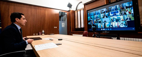 El presidente de la Junta de Andalucía, durante la videoconferencia con sus homólogos autonómicos y el del Gobierno central.