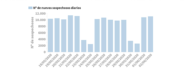 El Ministerio de Sanidad solo ha notificado un nuevo fallecimiento por coronavirus en las últimas 24 horas, lo que eleva a 63 los notificados en la última semana. Además, con respecto al día anterior, hay 219 nuevos casos confirmados por PCR, según la última actualización de los datos consolidados hasta las 12 horas. Además, el número de nuevos sospechosos diarios asciende a más de 10.000. Informa: