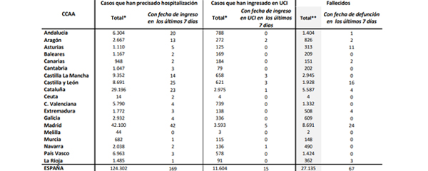 Las comunidades autónomas han notificado hasta ahora 241.310 positivos por coronavirus. Cerca de 2.000 se han diagnosticado en la última semana. Además, en España se han producido 27.135 fallecimientos con Covid-19 hasta el momento, 67 en los últimos siete días.