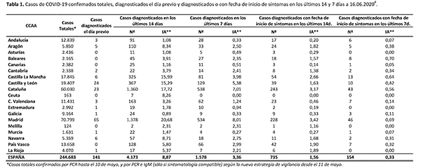 Las comunidades autónomas han notificado 76 nuevos casos diagnosticados de coronavirus en las últimas 24 horas, de los cuales 42 han sido en la Comunidad de Madrid y otros 14 en Cataluña. La Rioja, Murcia y La Comunidad de Murcia, además de las ciudades autónomas de Ceuta y Melilla, no han sumado ninguno. La cifra total se eleva hasta los 244.328 contagios, mientras que el cómputo global de muertes sigue sin actualizarse y se mantiene en 27.136.