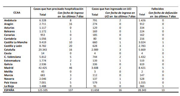TABLA: Evolución de la pandemia de coronavirus Covid-19 en España (hospitalizados, ingresos UCI y fallecidos)