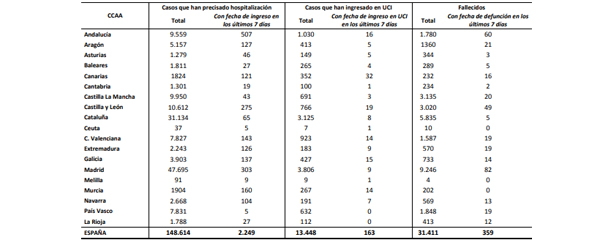 En los últimos siete días han muerto 359 personas con diagnóstico confirmado de COVID-19, una cifra menor a las 475 del informe del viernes. De los 359 muertes en la última semana, 60 se han producido en Andalucía, 21 en Aragón, tres en Asturias, cinco en Baleares, 16 en Canarias, dos en Cantabria, 20 en Castilla-La Mancha, 49 en Castilla y León, cinco en Cataluña, 19 en Comunidad Valenciana, 19 en Extremadura, 14 en Galicia, 82 en Madrid, 13 en Navarra, 19 en País Vasco y doce en La Rioja.