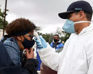 Sanitario comprueba la temperatura de una mujer en Brasil