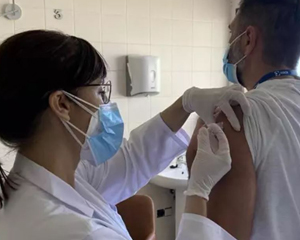 Sanitaria vacunando a un paciente