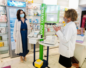 Isabel Díaz Ayuso en su visita a una farmacia.