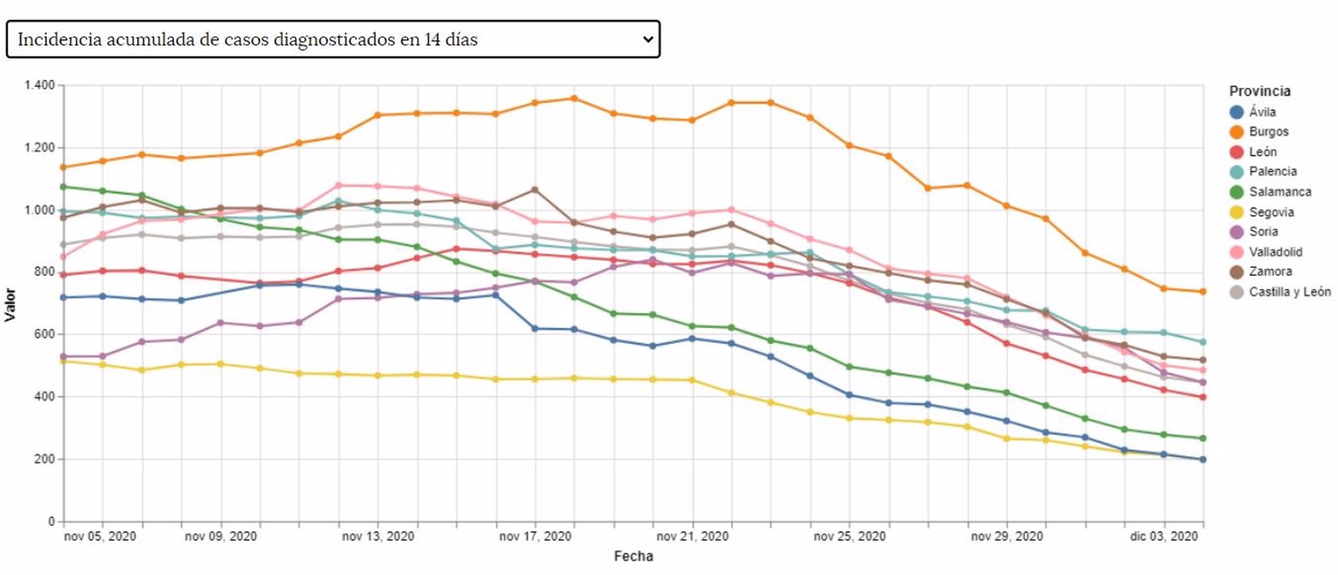 Evolución del dato de Incidencia Acumulada del coronavirus en 14 días en las provincias de Castilla y León.