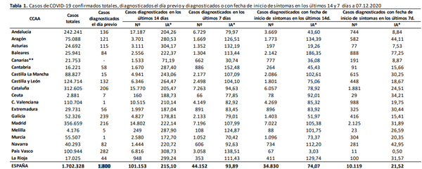 En la última semana, del 27 de noviembre al 3 de diciembre, las comunidades autónomas han realizado un total de 569.774 PCR, una media de 81.396 PCR al día. Además, desde el 27 de noviembre al 3 de diciembre, las comunidades autónomas han llevado a cabo un total de 327.643 test de antígenos (46.806 de media al día). Sumados a las PCR realizadas, suponen un total de 897.417 pruebas diagnósticas realizadas en este periodo, 128.202 al día. Aumenta así un cinco por ciento el número de pruebas diagnósticas realizadas, con una tasa de 406,51 por cada 1.000 habitantes.
