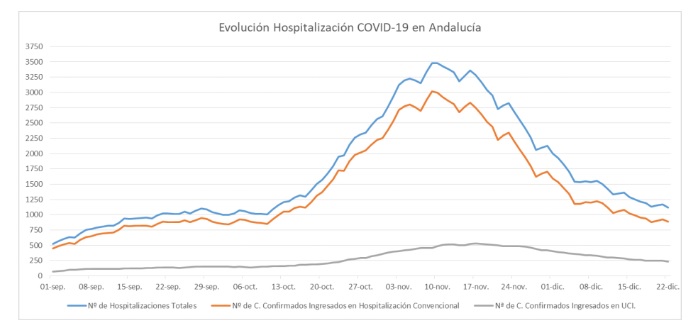 La Consejería de Salud y Familias informa de que, actualmente, 1.121 pacientes confirmados con Covid-19 permanecen ingresados en los hospitales andaluces, de los que 235 se encuentran en UCI.Por provincias: en Almería (96 hospitalizaciones, de las que 27 en UCI), Cádiz (198 hospitalizaciones, de las que 40 en UCI), Córdoba (108 hospitalizaciones, de las que 21 en UCI), Granada (215 hospitalizaciones, de las que 54 en UCI),