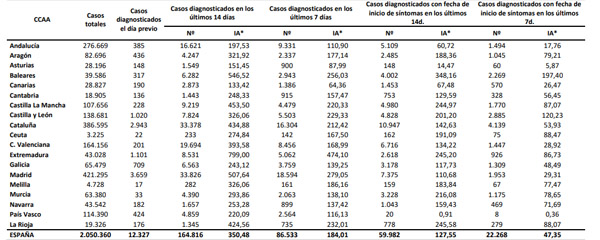 De las 12.327 personas diagnosticas de Covid-19 en Españaa en el último día, 3.659 se han localizado en Madrid, 2.943 en Cataluña, 1.101 en Extremadura y 1.020 en Castilla y León. Además, 385 se han detectado en Andalucía, 436 en Aragón, 148 en Asturias, 317 en Baleares, 190 en Canarias, 136 en Cantabria, 228 en Castilla-La Mancha, 22 en Ceuta, 201 en Comunidad Valenciana, 709 en Galicia, 17 en Melilla, 33 en Murcia, 182 en Navarra, 424 en País Vasco y 176 en La Rioja.