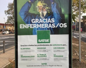 Satse ha puesto en marcha una campaña en mupis y vallas publicitarias de la Región para agradecer el esfuerzo de las enfermeras durante la pandemia que ha afectado a la salud de más de 106.000 murcianos y ha causado el fallecimiento de 1.511 personas en la Comunidad Autónoma. El número de casos de contagio por la Covid-19 entre el personal sanitario supera los 130.000 en toda España. El Sindicato de Enfermería de Murcia reconoce públicamente, de esta manera, el trabajo de todos los profesionales en su labor diaria contra el coronavirus bajo el lema: 'Gracias Enfermeras/os'.cEste aplauso gráfico al colectivo se hace patente a través de soportes exteriores colocados en Murcia, Cartagena, Lorca y Caravaca. Las cuatro ciudades concentran la mayor población regional y son nexo de comunicaciones para llegar a cada usuario de la sanidad pública. Se agradece la humanidad demostrada por cada uno de los profesionales de la enfermería, así como el trabajo incansable, la renuncia al descanso y a la conciliación familiar, y los cuidados a los pacientes por encima de la propia seguridad.