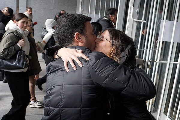 Una pareja se besa antes de que la aspirante entre en el examen.