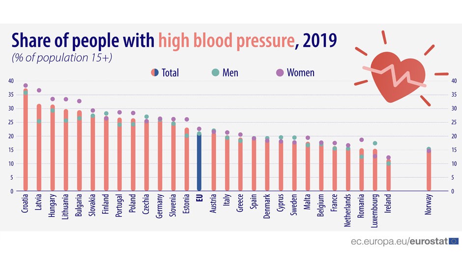 Las proporciones más altas de mujeres con presión arterial alta se registraron en Croacia (38 por ciento), Letonia (37 por ciento) y Hungría (34 por ciento). En lado contrario, con una mayor cifra de hombres con presión arterial alta, se sitúan Hungría (29 por ciento) y Finlandia (28 por ciento).