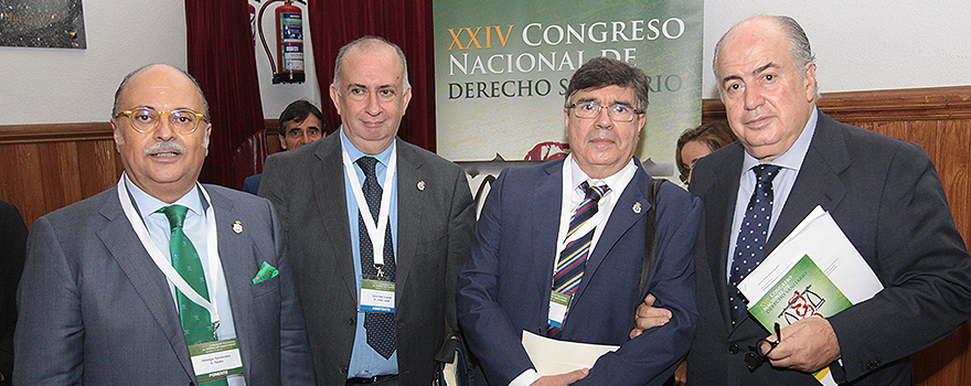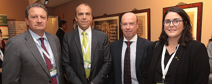A la izquierda, Pedro Hidalgo saluda a Ignasi Pidevall, director jurídico del Colegio de Médicos de Barcelona. A la derecha, Oswaldo Romo, presidente de la Asociación Iberoamericana de Derecho Sanitario; y Víctor Frigiari, presidente de la Asociación Argentina de Derecho Sanitario. |