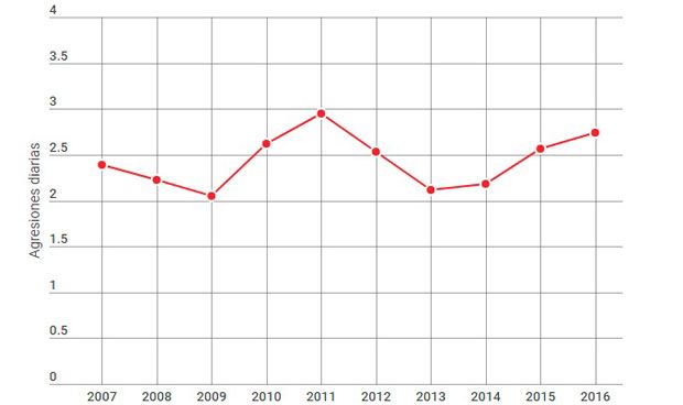 evolución de las agresiones que han sufrido los trabajadores del SAS en un periodo largo (2007-2016). Desde entonces, se ha registrado una media de 2,4 agresiones diarias. Es decir, cada día más de dos sanitarios son agredidos en algún punto de Andalucía.