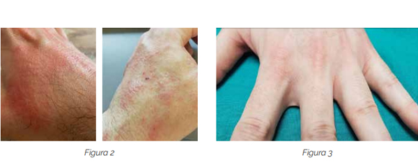 1. Si la reacción inflamatoria se presenta con vesiculación no pruriginosa, se trata de un eczema irritativo vesiculoso. Si, por el contrario, la reacción inflamatoria se presenta con pápulas eritematosas sobre un fondo inflamatorio, se trata de un eczema irritativo de contacto. En este caso, el experto aconseja aplicar Dexyane Med crema reparadora calmante durante el día. En aquellos profesionales que refieran picor intenso, o bien se observe inflamación intensa, puede indicarse por la noche un corticoide tópico de potencia media (por ejemplo, metilprednisolona acepotano 0,1% crema) hasta que la reacción inflamatoria esté controlada.