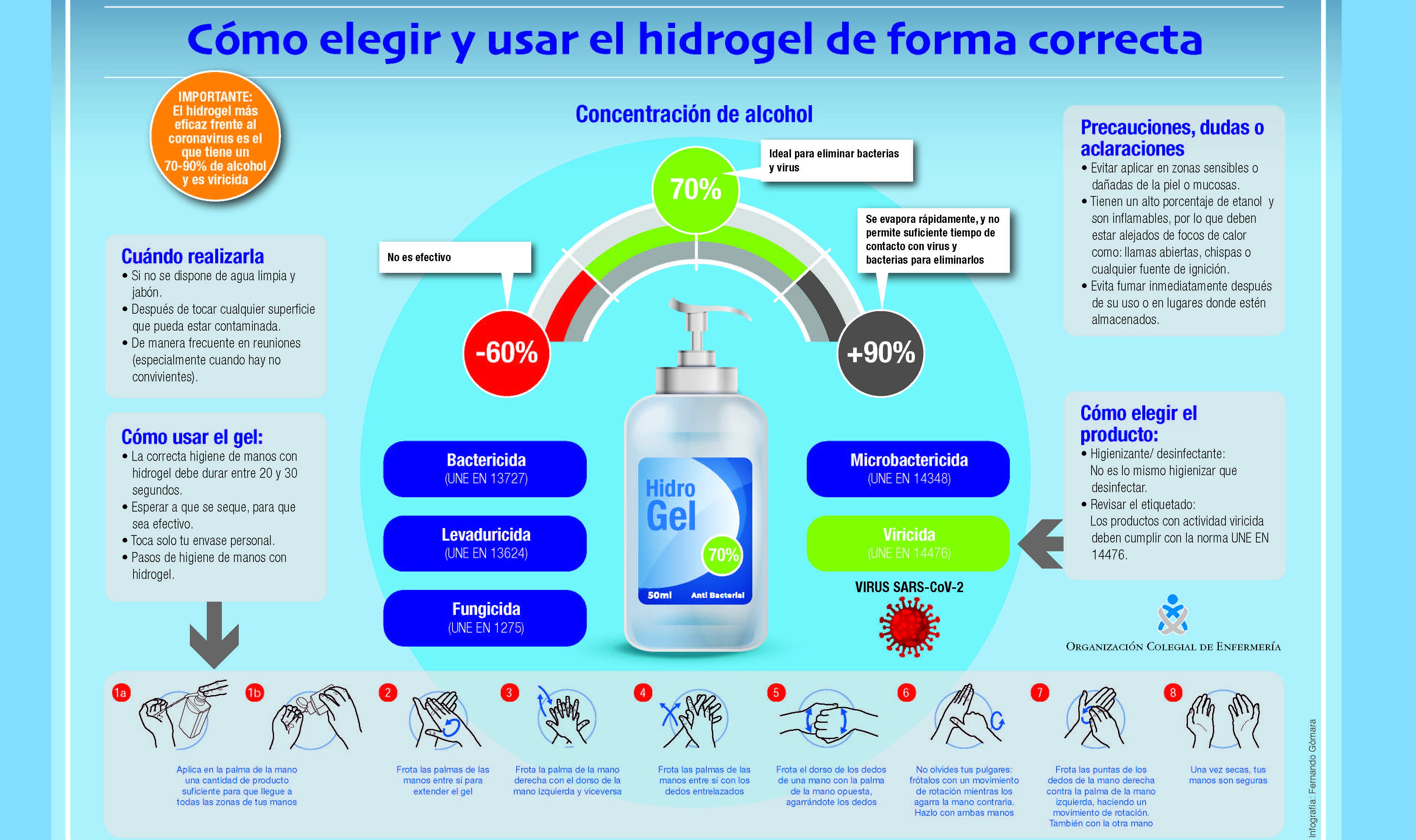 alcohol de entre el 70% y el 90%. Teniendo en cuenta que el SARS-CoV-2 es un virus debemos comprar hidrogeles con efecto viricida y muy preferiblemente que cumplan la normativa UNE14476”, resalta María Enríquez, enfermera del Consejo General de Enfermería.