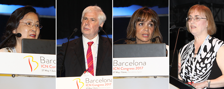 Liming You, profesora de la Universidad Sun Yat-sen; Michael Riordan, asesor ministerial del Estado de Queensland (Australia); Amelia Amézcua, directora de la Fundación para el Desarrollo de la Enfermería; y Jean White, enfermera jefe de Gales.