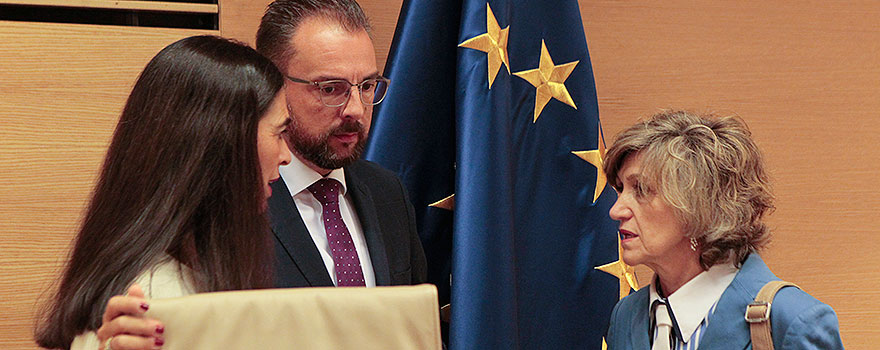 María del Carmen Hernández y Bienvenido de Arriba, vicepresidentes de la Comisión de Sanidad, hablan con la ministra antes de comienzo de su comparecencia. |