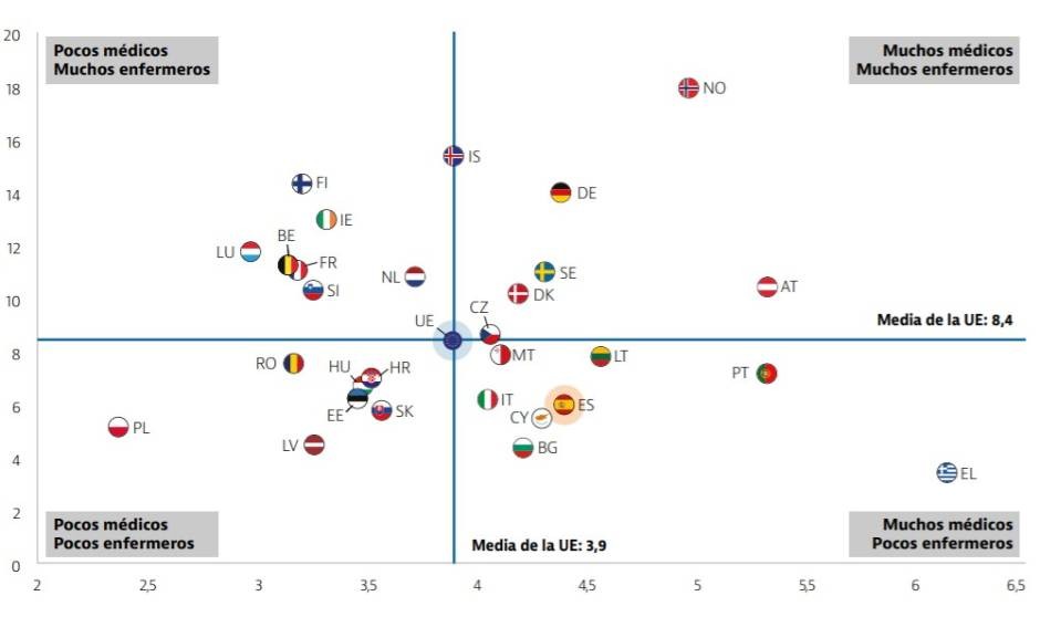 Asimismo, el documento destaca que, a pesar de que el número de médicos por cada 1.000 habitantes en España está ligeramente por encima de la media de Europa,