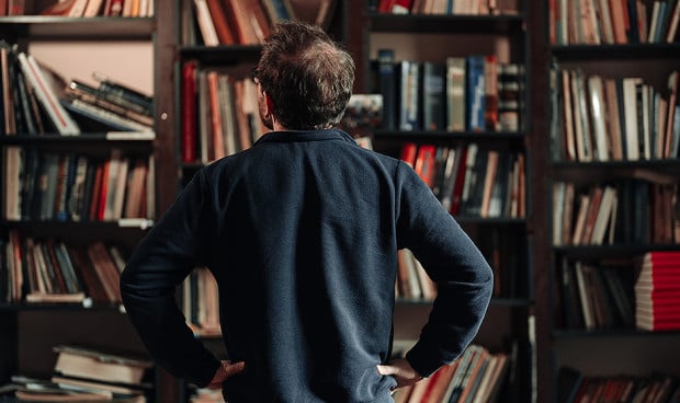 Hombre mirando hacia una estantería de libros.
