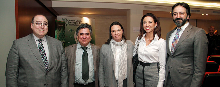 María Rosa López-Torres, tesorera del Consejo General de Farmacéuticos; Pepita Ortega, presidenta del Colegio de Farmacéuticos de Almería; Alba Soutelo, presidenta del Colegio de Farmacéuticos de Pontevedra; Luis Amaro, secretario del Consejo General de Farmacéuticos, y Javier Alcaraz, presidente del Colegio de Farmacéuticos de Valladolid. |